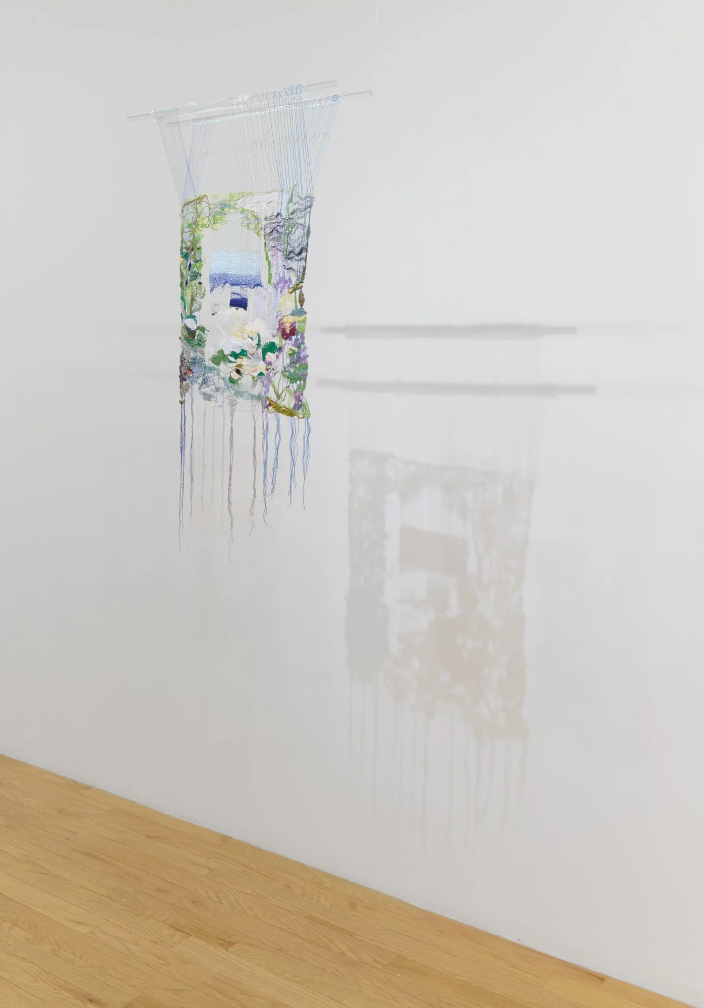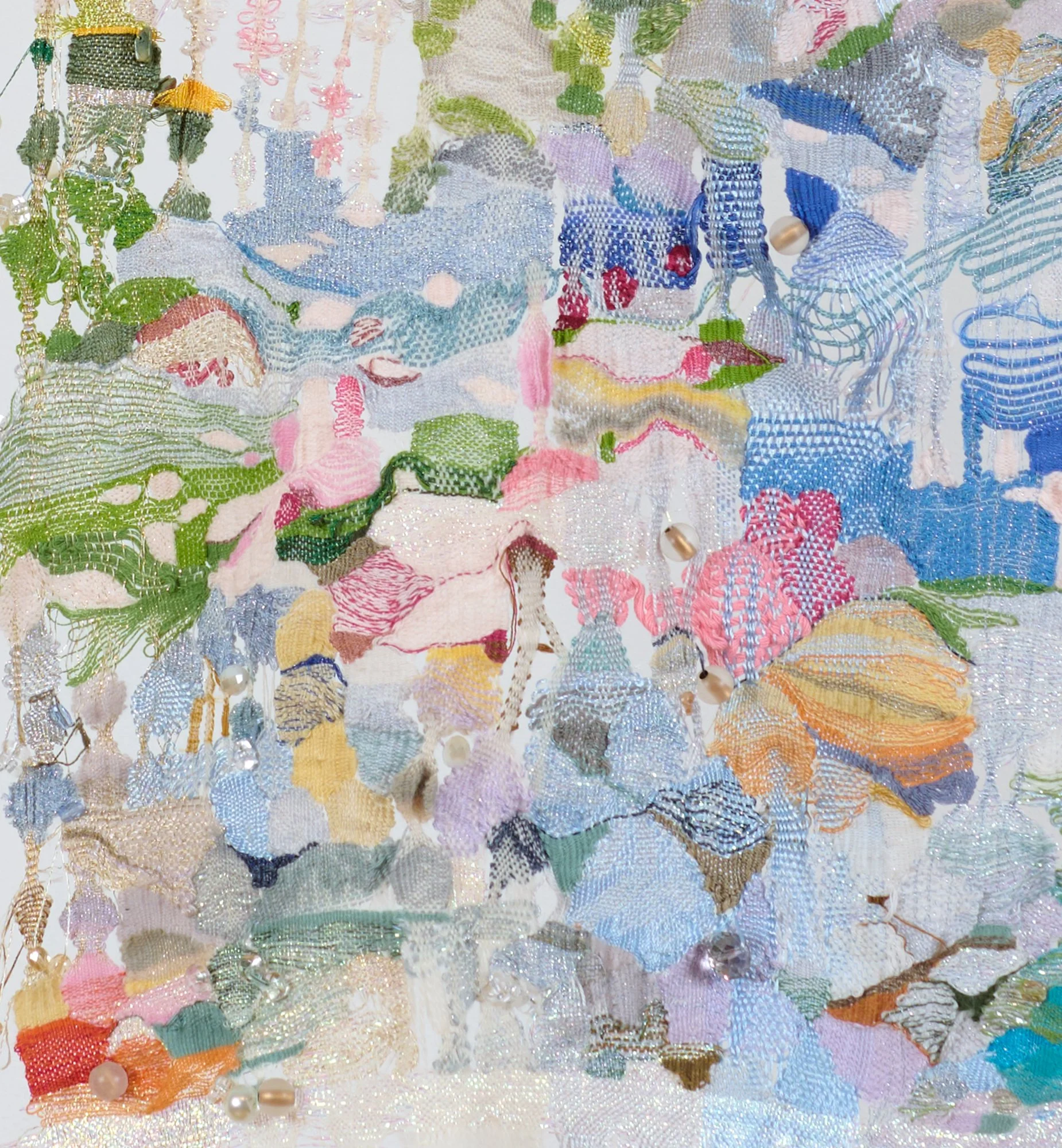 Detail, Jacqueline Qiu, Murmur, 2025. Handwoven tapestry on vertical loom using cotton, wool, silk mohair, mohair, silk, shigoki paper yarn, shosenshi paper yarn, pine paper, raw silk, linen, rayon, bouclé yarn, metallic yarn, lurex yarn, hand-cut stone beads, and other beads, hand-painted cotton warp using acryl gouache and gouache, 91 x 45 in, 231.1 x 114.3 cm. Image courtesy of the artist and CHART. Photo: KC Crow Maddux.