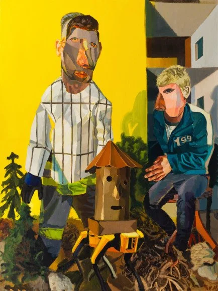 Jakub: The exhibition at Asya Geisberg Gallery is the culmination of a larger series of paintings exploring the relationship between humans and new technologies. Robots and drones appear here not only as assistants, but also as pets or partners. I want to explore the possibilities of coexistence between two entities: humans and machines, where the machine in my paintings can acquire mental or physical parameters of a human or an animal. "The Field Robot of Myself" is a title that emerged with the help of a generative word model. This can also be considered a certain type of collaboration between human and machine. I input prompts related to my interest in the topic (human/machine), and through gradual correction of the machine's outputs, we arrived at this somewhat surrealist title. It could be said that it is a kind of verbal self-portrait from my recent period, encompassing my interest in work.