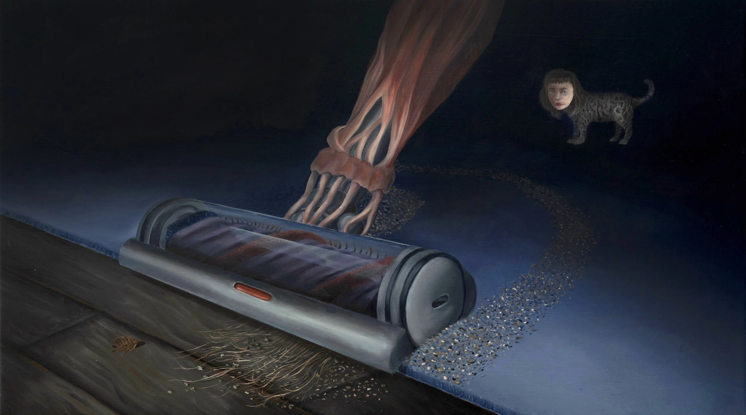 CD: One of your paintings, Cyclone v10 absolute, has a human-vacuum hybrid in it. Can you talk more about that piece and your decision to merge flesh and the machine?