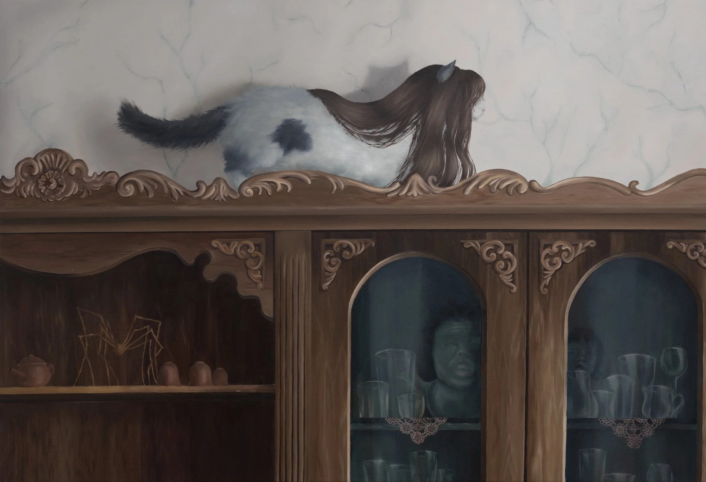 RX: My mom and I lived with 15 cats when I was growing up. When you live with this many cats, you realize they each have their own personality; it’s kind of like a reality TV show or a mockumentary. Some cats are bullies, other cats would constantly seek my mom’s attention, and there’d be a few cats who could not be allowed in the same room because they hold these crazy grudges against each other. There’s so much drama among them, and I naturally started anthropomorphizing all of these cats. I recently read a study that said the tendency to anthropomorphize objects or animals is connected to seeking certainty and connection. I would say the cats in my paintings symbolize this impulse, because uncertainty is just so hard to live with, and I’m still trying to find my own connection and purpose. As for why they are hybrids, I resonate with the human figure more when it’s fragmented, because I’d rather use symbolism and animal or object imagery to depict something reminiscent of the human figure. I like the idea of having layers of hidden meanings hiding underneath all the symbolism.