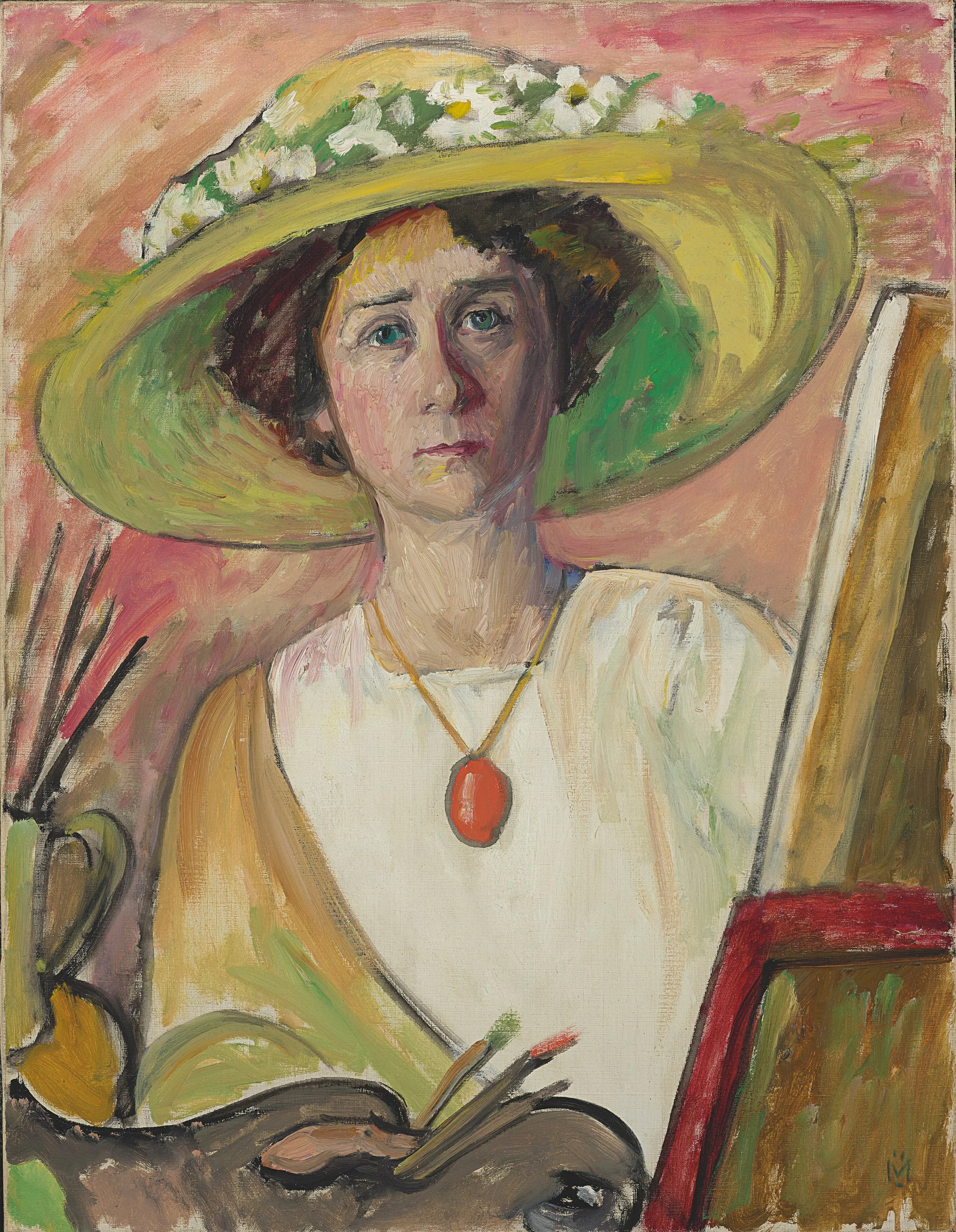 Gabriele Münter, Self-Portrait in Front of an Easel(Selbstbildnis vor der Staffelei), ca. 1908–09. Oil on canvas, 3011/16 × 2313/16 in. (78 × 60.5 cm). Princeton University Art Museum, Gift of Frank E. Taplin Jr., Class of 1937, and Mrs. Taplin. © 2025 Artists Rights Society (ARS), New York / VG Bild-Kunst, Bonn.Photo: Bruce M. White, Princeton University Art Museum / Art Resource, NY