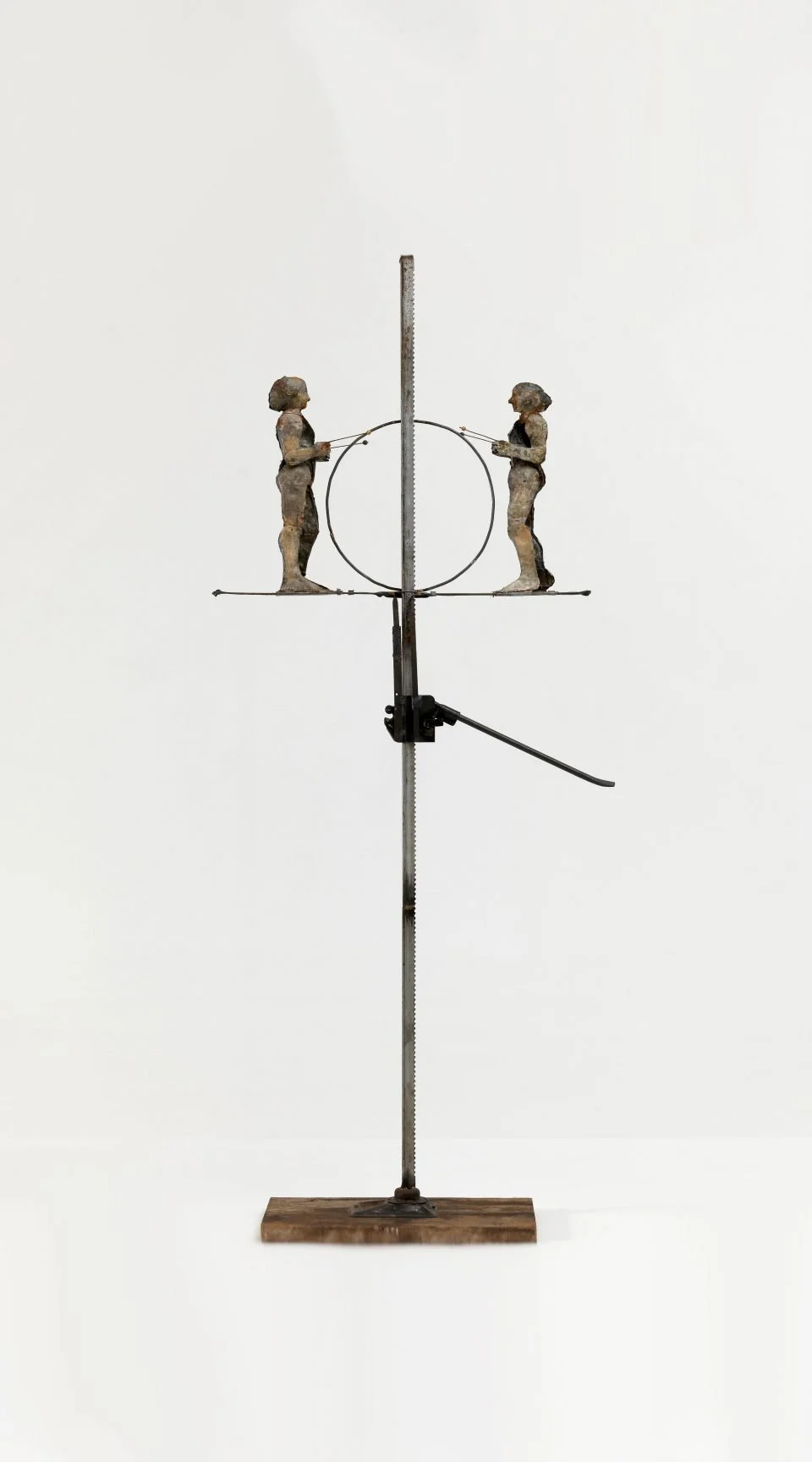 The interdisciplinary curation allows visitors to move between the various scales, media, and characters that Leaf folds into this whimsical universe. Recurring motifs and gestures become familiar friends in this way, and framed works on the walls lay the foundation for metal sculptures that occupy space with commanding presence. Painterly works also hold ground, deftly referencing the western canon of painting at one moment, and referencing set design the next. This is a testament to Leaf’s ability to masterfully craft abstract narratives that are formed of similar language but glide through various dialects in a nomadic dance of artistry.