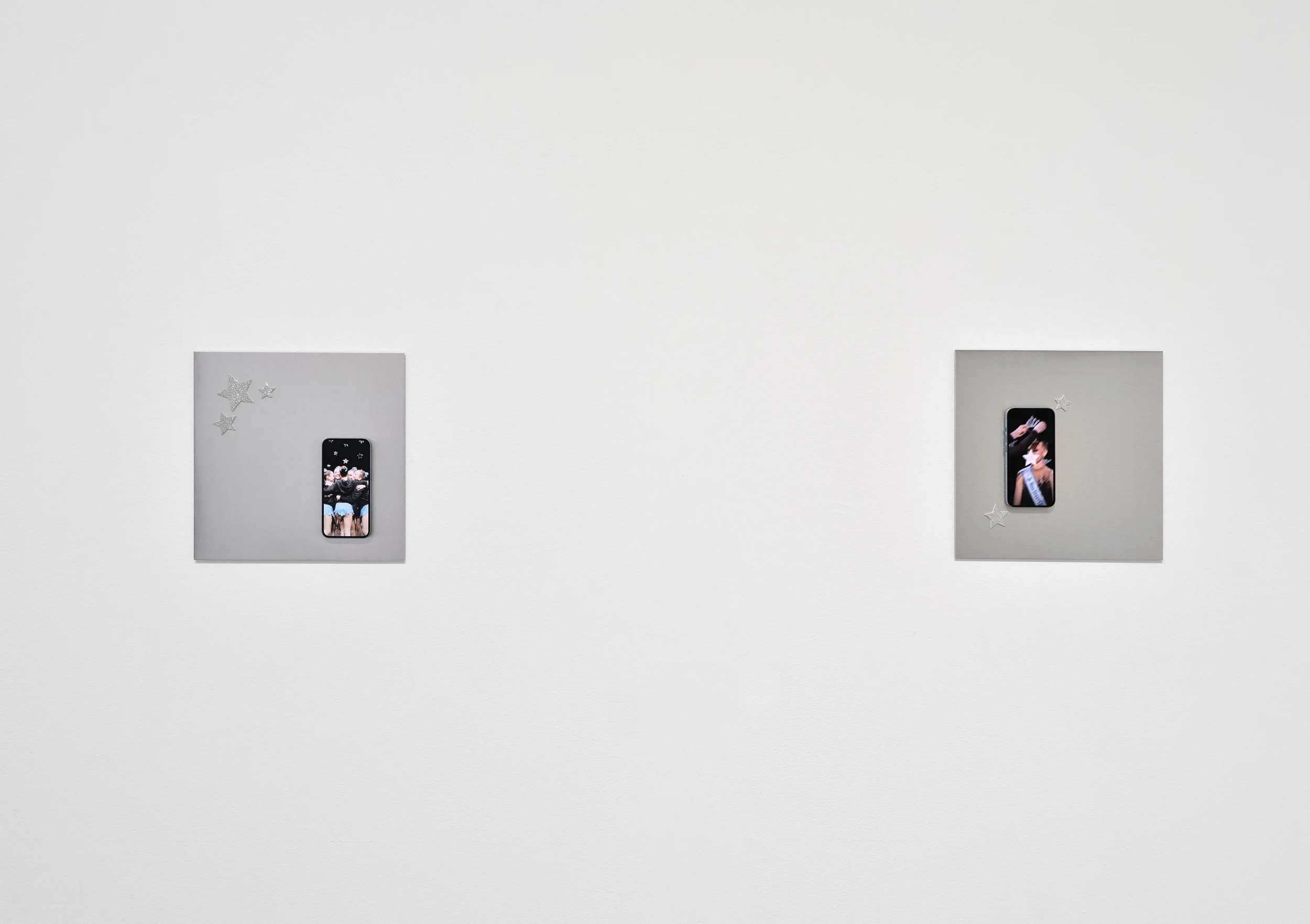 The StarQuest Edits are presented on iPhones mounted to metal wall tiles etched with stars and hearts. Intended to mirror the consumption logics of TikTok and Instagram Reels, each phone scrolls through “fan edits” of the StarQuest scenes using CapCut templates, successfully reproducing the ambiance of a social media feed. The StarQuest Edits are intended to “point towards the circulation of young women’s bodies online as content and algorithmically mediated spectacle”; however, they reproduce the formal language of their subject - fan culture - with such fidelity that they are virtually indistinguishable from it. The iPhone as a display device is a curatorial choice so literal that it collapses into tautology: social media content on the device on which one views social media content. The work enacts the conditions it describes so frictionlessly that it cannot escape or add new meaning to them.