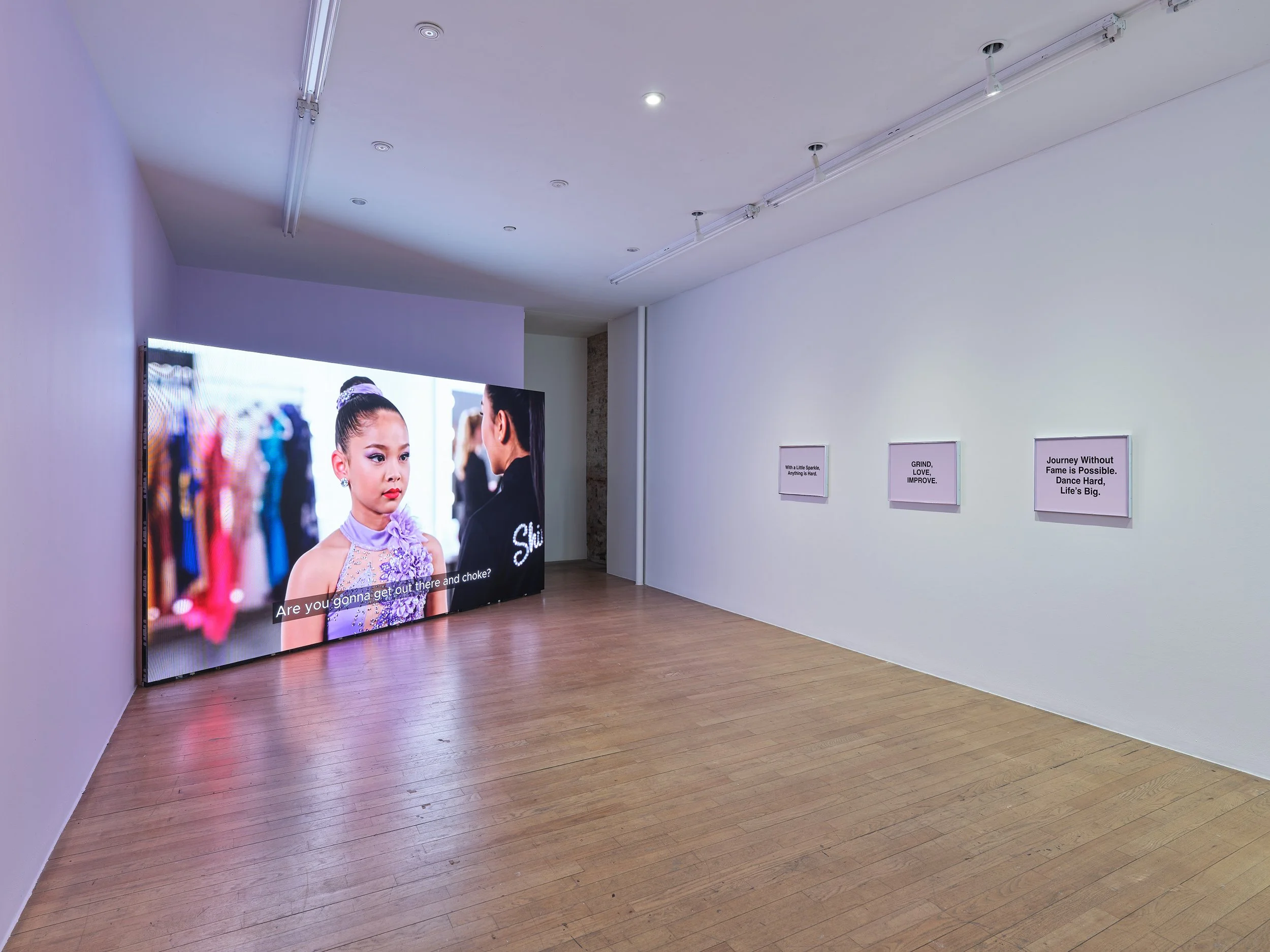 At bitforms gallery, Maya Man's solo exhibition StarPower presents a meditation on competitive dance culture and the construction of girlhood using algorithmic image production to illustrate the harsh realities of both constructs and their shared performative nature. The exhibition space is sparsely populated, anchored by a large LED screen in the corner of the main room playing StarQuest.