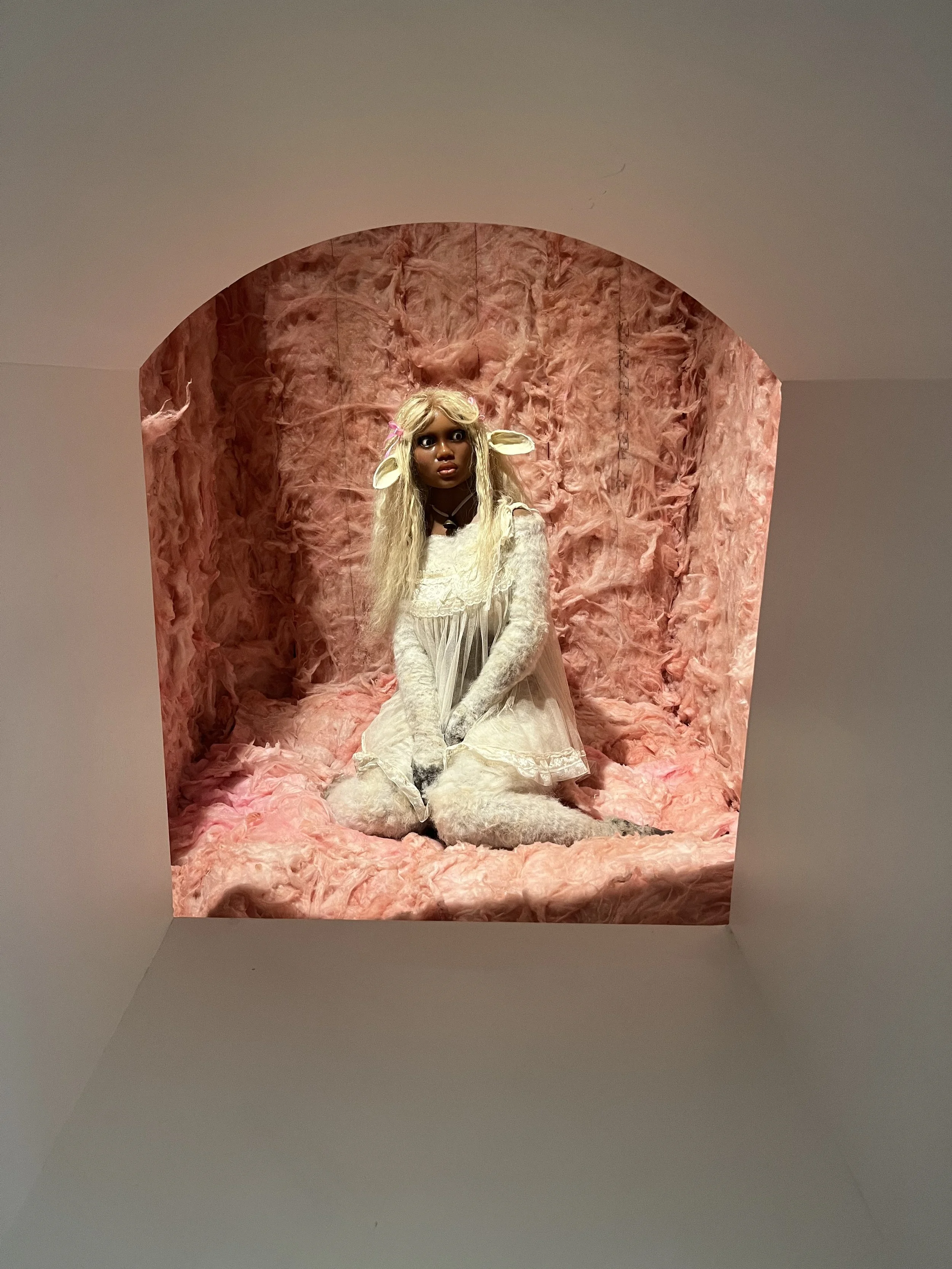 The exhibition may grapple with our layered and ever-shifting relationship with technology, but the building itself suggests a parallel inquiry. Designed as a seamless integration of two distinct yet connected structures, the new museum layout proposes something like an “unfixed” architecture. Movement through the building is primarily horizontal, encouraging zigzagging navigation across floors rather than a hierarchical ascent. Interstitial zones and a central public space create moments of (sometimes awkward) pause and transition, mediating between galleries, elevators, terraces, and communal areas. These spaces are meant to be both functional and conceptual, but they can also prove to be tricky as display sites. I found myself moving through Precious Okoyomon’s When the Lambs Rise Up Against the Bird of Prey (2024) more quickly than I would have liked, rushed by its placement in a narrow, transitional corridor between galleries. This installation consists of a seated animatronic, anthropomorphic lamb that responds to the viewer’s presence by silently locking its gaze with theirs. Yet this provocation feels diminished by its placement. This feeling is compounded by the fact that the work appears here in a markedly reduced, seemingly incomplete, form. Not only is it stuck in a shaft most visitors would not notice or care to pass through, but it is also encased in a box filled with fiberglass, as if it had only just arrived. In other iterations, the animatronic work has been presented as part of an artificial forest saturated by scent and live sound in a more elaborate and interactive setting. Here, the opportunity for a more sensational experience and the work’s deep references to poet Anne Boyer’s riposte to Friedrich Nietzsche’s On the Genealogy of Morals are completely lost.