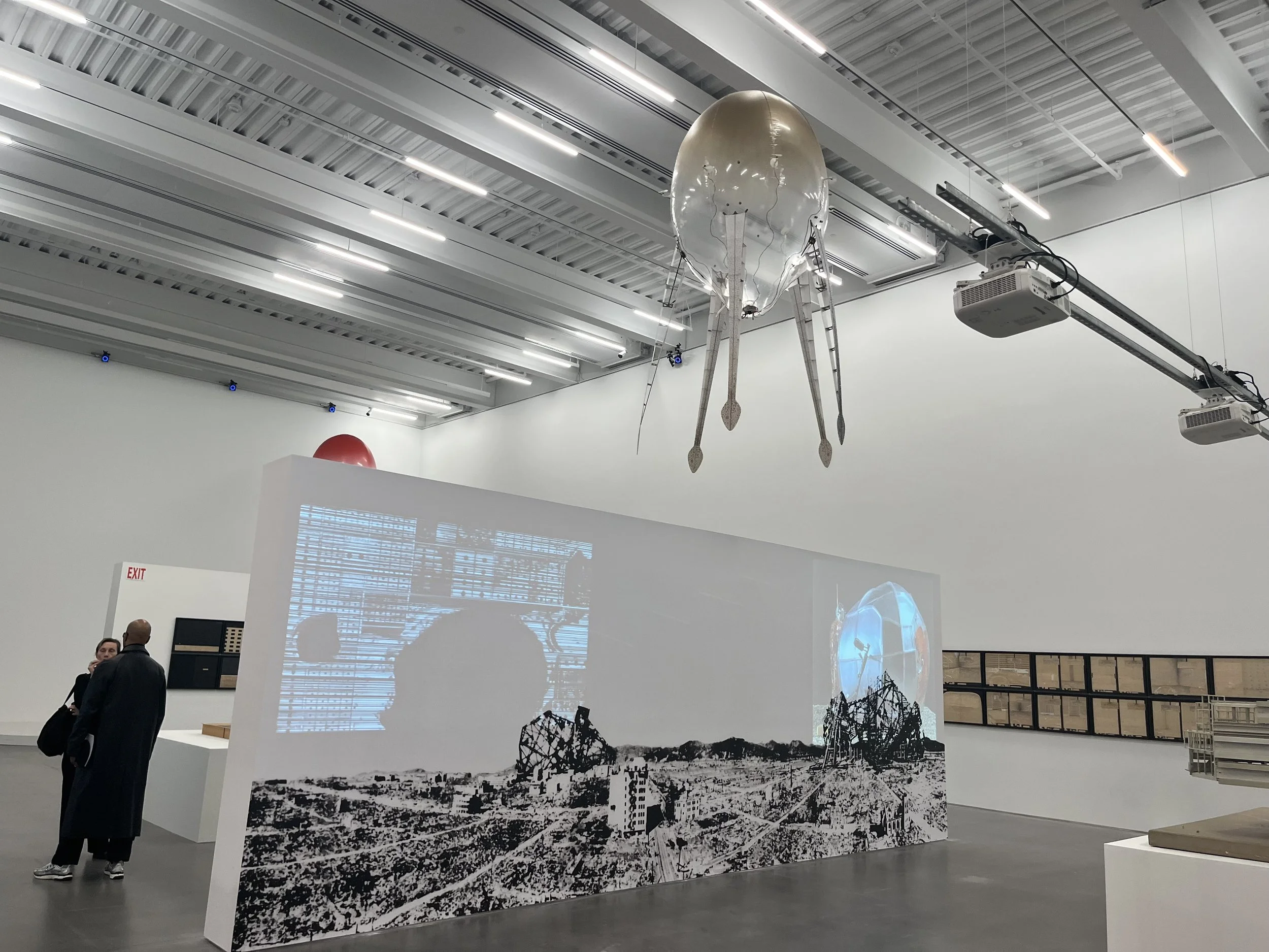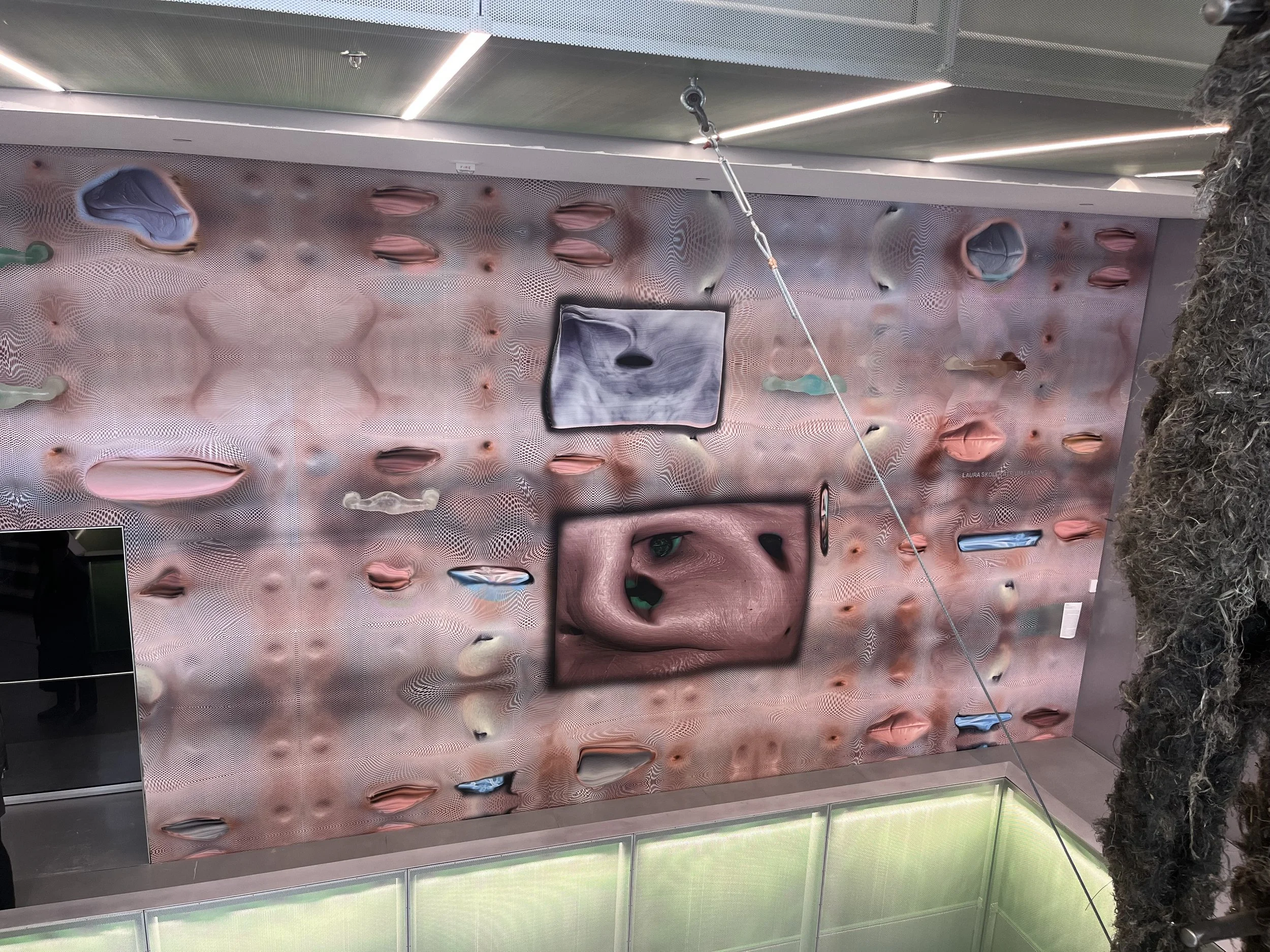 To avoid the constraints of a linear timeline and offer sharper definition to its broad scope, the exhibition is organized into ten themes that read like sci-fi titles: Reproductive Futures, Mechanical Ballets, Prosthetic Gods, Leviathans, Dream Machines, Automatic Women, New Images of Man, Postapocalyptic Creatures, Human Animal, Homunculus, Animacies, Hall of Robots, and The City. Within this expansive framework, some of the works emerge as particularly resonant. The inclusion of Tishan Hsu’s work, ears-screen-skin: New York (2025), mounted as wallpaper in one of the museum’s atria, adds a nightmarish meditation on the body’s reconfiguration through material encounter. It employs the artist’s characteristic irregular surface and textures that simulate the body as a kind of viscous, sensorial wetware caught in an entanglement of overlapping technical systems. Anicka Yi’s artificial life simulation work In Love with the World (2021) occupies parts of the fourth-floor gallery with hovering, biomorphic devices called aerobes that drift around like speculative organisms. Modeled after ocean life and fungal networks, these delicate, translucent entities appear as a whimsical take on the surveillance balloon, but their presence is non-threatening. Their design proposes an alternative vision of intelligence, prompting viewers to imagine technologies that coexist with, rather than dominate, their environments. In Mechanical Kurds (2025), Hito Steyerl brings together a single-channel video with a foregrounding sculptural component. The work’s title invokes the layered history of the “Mechanical Turk,” which first appeared as an 18th-century illusion of automation in a chess-playing figure that seemed self-operating but was secretly guided by a concealed human; and later the name was revived as Amazon’s digital labor platform, where low-paid distributed workers complete outsourced, often repetitive tasks. By drawing on these interconnected references, the video installation probes and offers a critique of the persistent dependence of human labor and the appearance of machine autonomy.