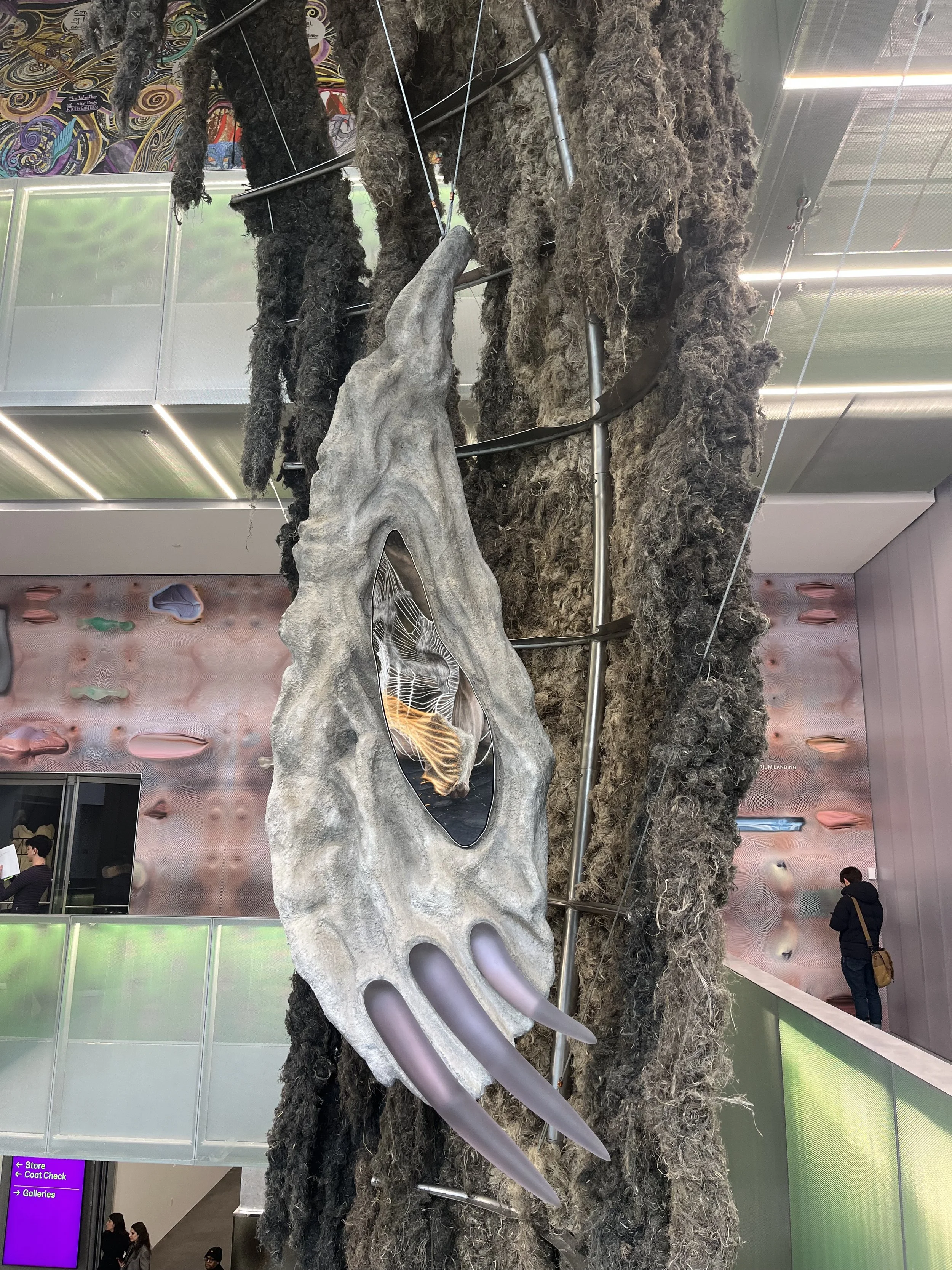 It is also worth noting that otherwise the architecture manages to recede into the background of experiencing the artwork. In a moment defined by a near-obsessive focus on innovation and spectacle, the building forsakes demanding attention, and in most cases, it frames it without overwhelming it. In select areas, there is a strong emphasis on public engagement where commissions by artists activate the façade, atrium, and eventually the plaza. Tschabalala Self’s Art Lovers (2025) is a site-specific work marking the “kiss point” between the museum’s two adjoining buildings; Klára Hosnedlová’s massive sandstone, glass, and fiber sculpture Shelter (2026) takes over the atrium stairwell; and VENUS VICTORIA by Sarah Lucas will be on view for a two-year period in the museum’s new outdoor plaza, extending the museum’s reach beyond its interior. These works signal an understanding of the museum as part of a broader urban and social ecology, extending the internal space to the public realm of passersby and residents of the neighborhood.