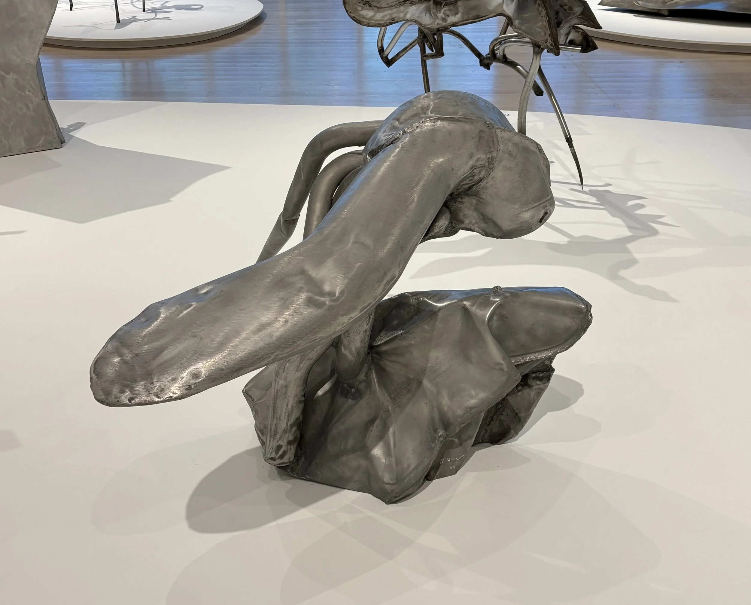 Tube Form (1966) uses metal’s (in this case, aluminum) tensile proclivities to toy with the viewers’ visual impressions of balance: a thick, sinuous form seems to levitate, supported by slender tendrils apparently far too diminutive to shoulder the weight. The same is true in Opposed Forms (1965), where a mass of steel stands precariously on two spindly legs, further supported by a very casual assemblage of jerry-rigged narrow tubes. The sculptures themselves are ingeniously balanced, but the spectator is thrown off-kilter, also adding to the vaguely threatening sensibility of Hunt’s pieces. But, balance, or lack of balance, can go both ways, so a piece like the cast bronze maquette for I Have Been to the Mountain(1977) is so firmly planted on the ground, vis-à-vis its length to height ratio, that it has that deceptive geology of a gently ascending slope that distorts the magnitude of the actual magnitude of a mountain. Low Flight (1998) is an inverted tornado—it swirls up from a wide base to an impossibly narrow apex—again much like Boccioni, his Development of a Bottle in Space (1913), but while the weight seems evenly distributed, the fact that the flanges of the base of Hunt’s sculpture don’t evenly touch the ground, make this conical shape seem to whirl and wobble.